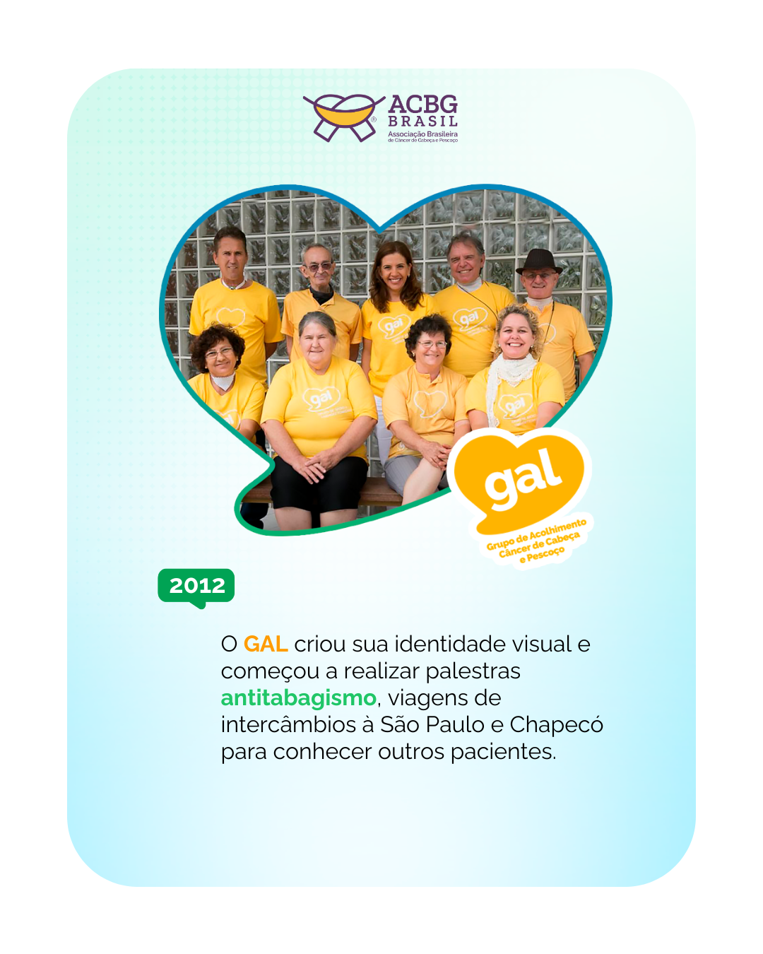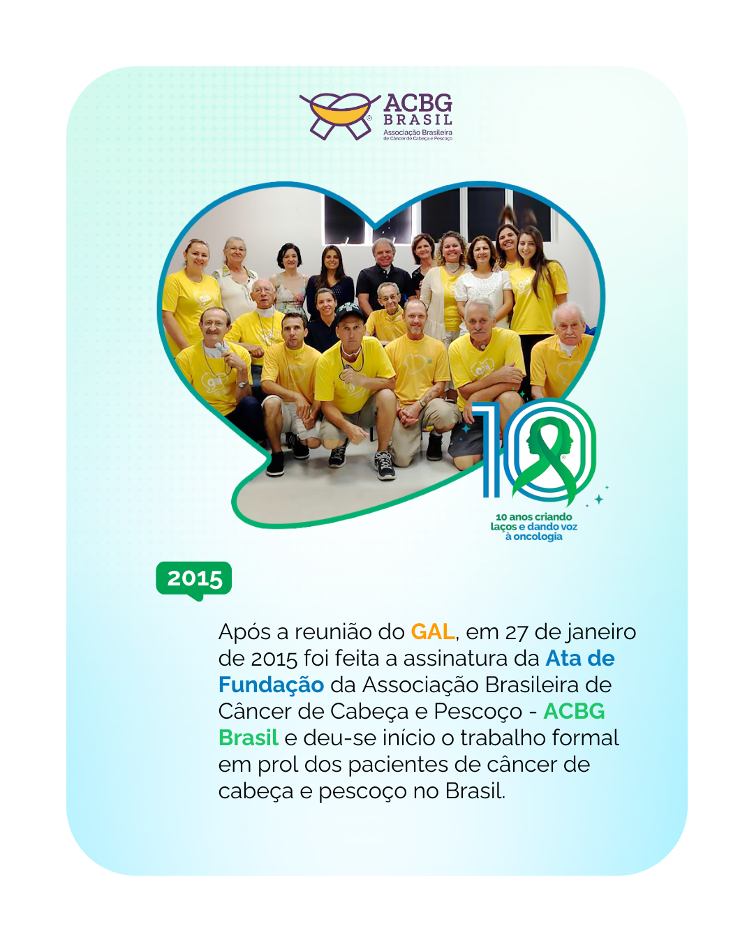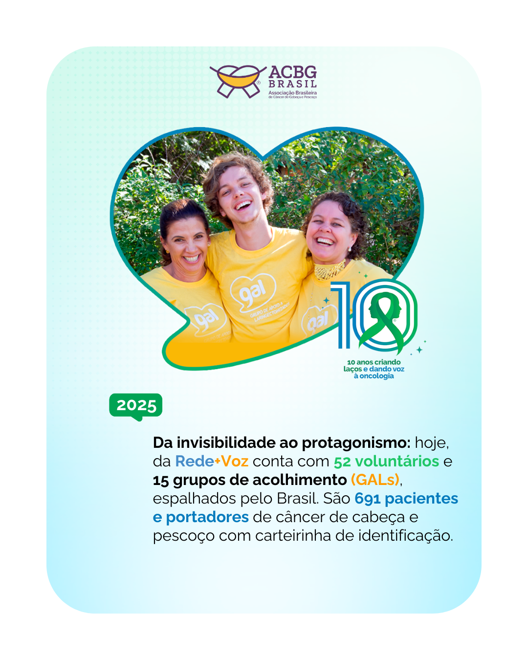Neste marco especial de 10 anos, celebramos conquistas como os 15 Grupos de Apoio a Pacientes de Câncer de Cabeça e Pescoço (GALs), que atualmente atendem em todo o Brasil, oferecendo acolhimento e suporte a pacientes, portadores, cuidadores e seus familiares, e a formação de lideranças por meio da Rede+Voz, composta por 52 voluntários que fortalecem o protagonismo e a nove grandes campanhas que de prevenção do câncer de cabeça e pescoço que impactaram milhões de pessoas.