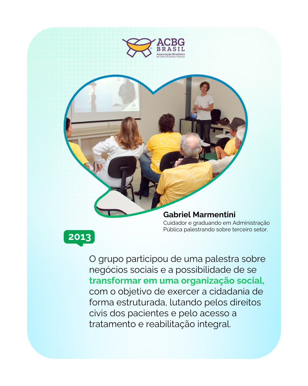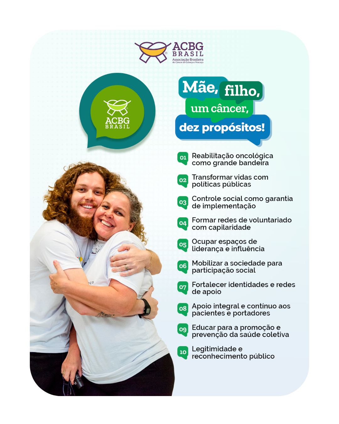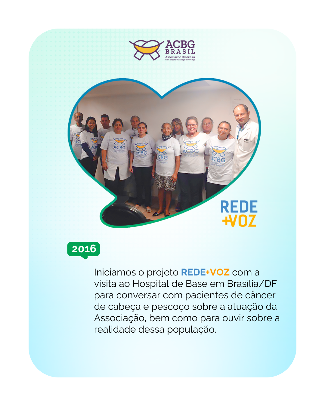 Somos a Associação Brasileira de Câncer de Cabeça e Pescoço, a ACBG Brasil. Nascemos a partir de um grupo de pacientes de Florianópolis em 2015 com atuação nacional em prol dos direitos das pessoas acometidas com cânceres nesta região.